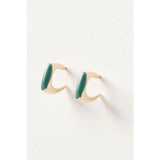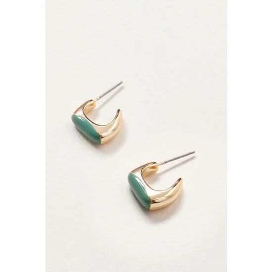 On chunky gold-toned square hoop earrings, a teal inlay is presented, adding a pop of colour.