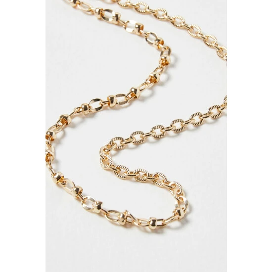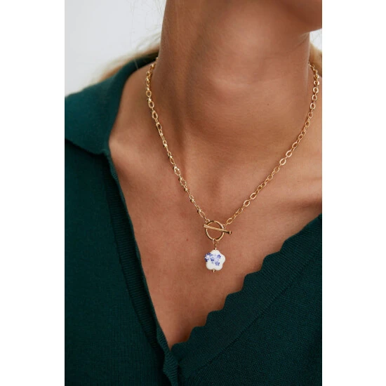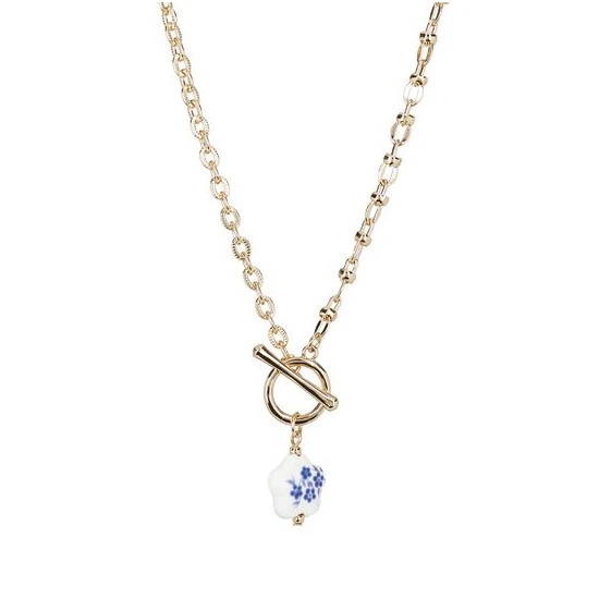 This gold-toned chain necklace is detailed with a white and blue ceramic floral pendant, complete with a bar and ring clasp.