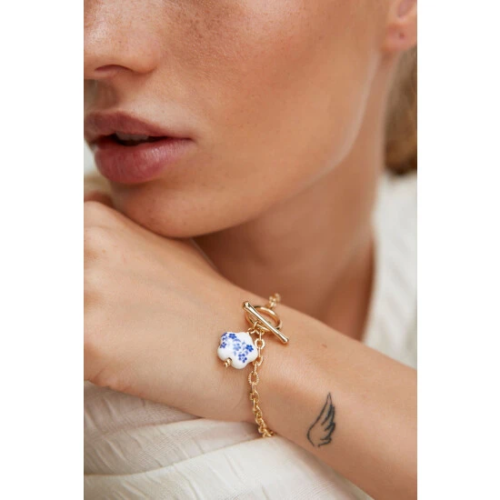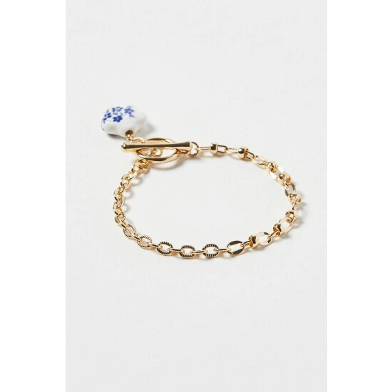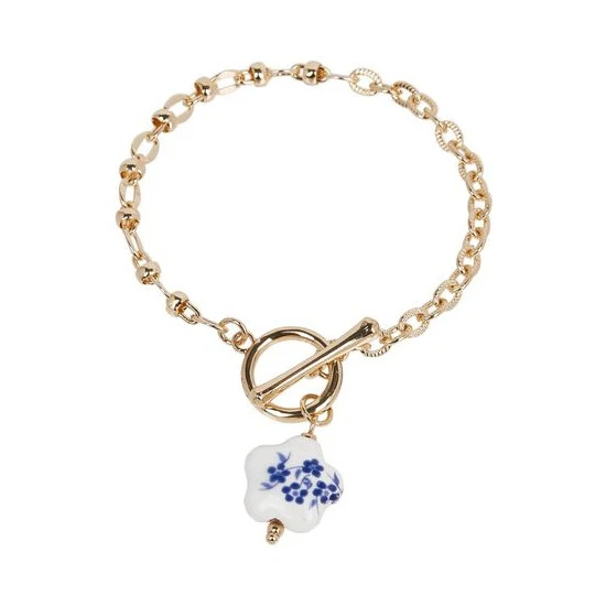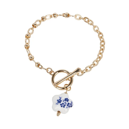 This gold-toned chain bracelet is detailed with a white and blue ceramic floral pendant, complete with a bar and ring clasp.