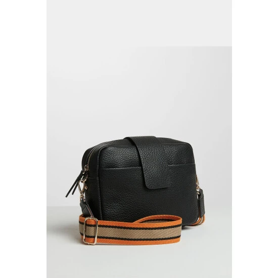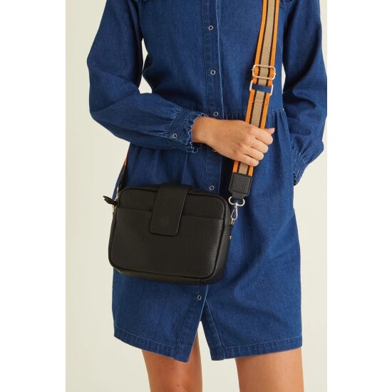 In a rectangular profile, this black cross-body bag contains one lined main compartment and one zipped inner pocket, with an outer slip pocket for your essentials. Featuring a contrasting woven detachable cross-body strap with gold-toned hardware, this bag is completed with a zip fastening and a foldover flap.