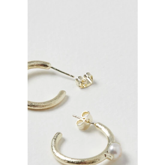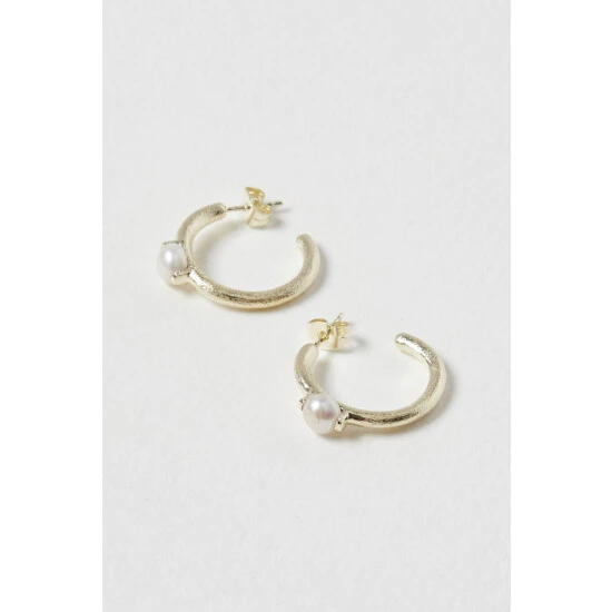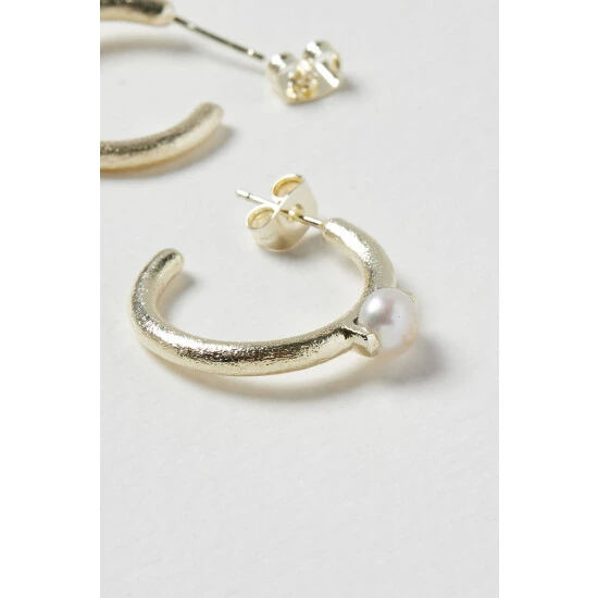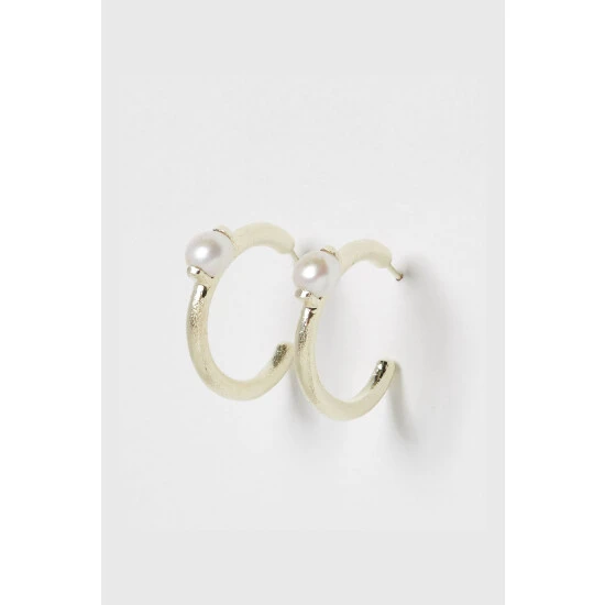 On textured gold toned hoops, these earrings feature a circular pearl bead in the middle and are suspended from stud backs.