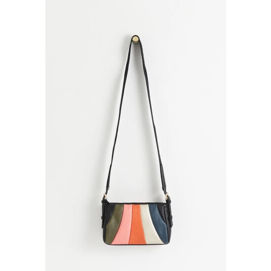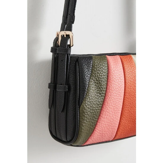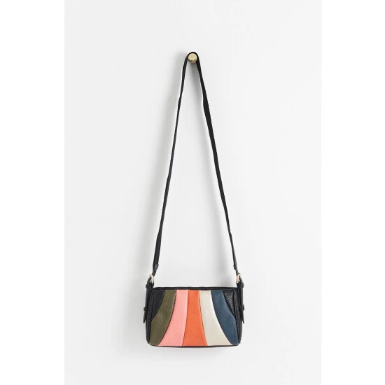 In a curved silhouette, this cross-body bag features a striped design for a pop of colour against the overall black tone. With adjustable buckle fastenings in a gold tone, this cute yet compact bag is complete with a comfortable fabric strap.