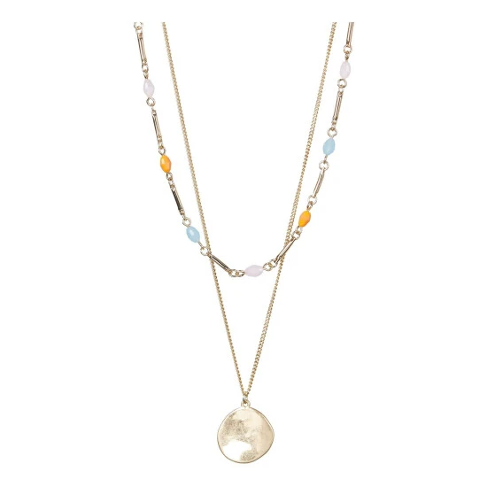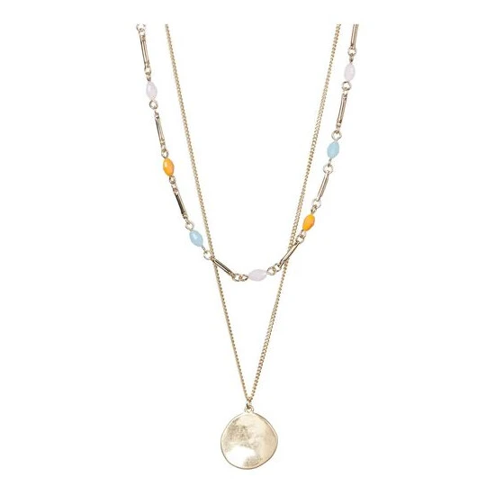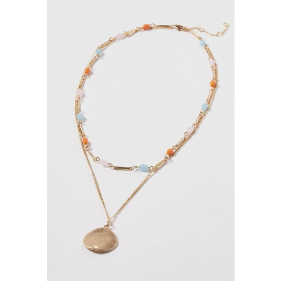 In a double row design, this gold toned necklace features a chunky beaded chain against a dainty curb chain, anchored by a matte disc charm.