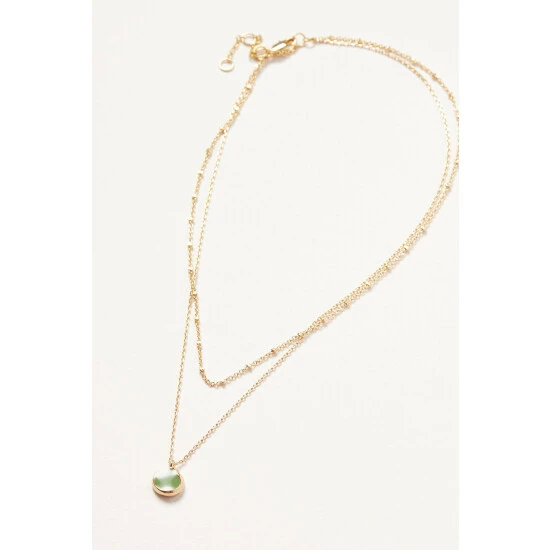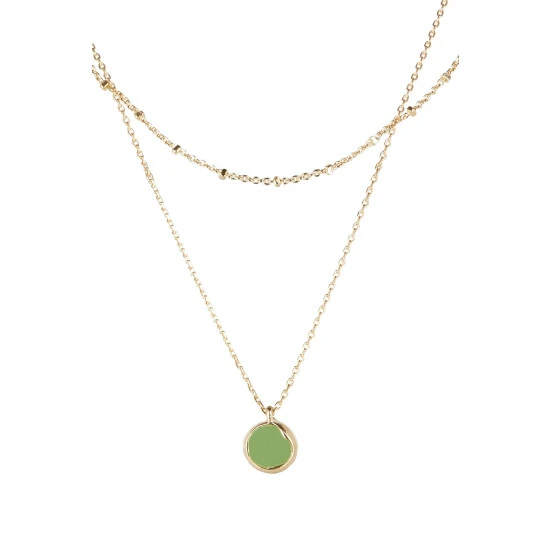 On a layered gold-toned beaded chain, a simple green disc is surrounded with a gold-toned lining and hangs from an adjustable chain with lobster clasp.
