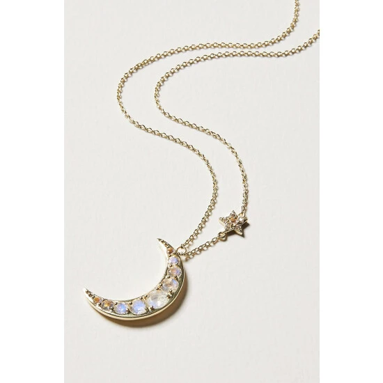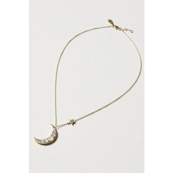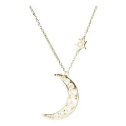 Sparkle like the night sky with this statement pendant necklace. Featuring a large crescent moon charm adorned with iridescent stones, suspended from an extendable gold toned chain sporting a dainty star design, and completed with a lobster clasp.