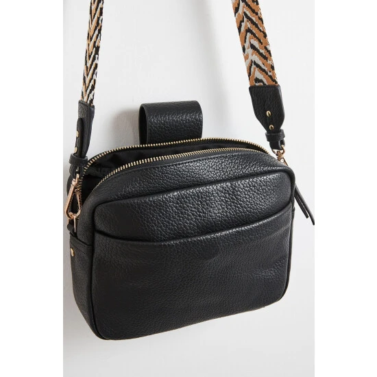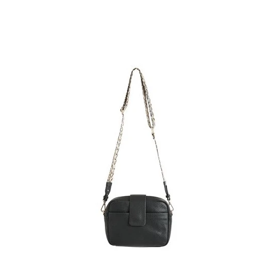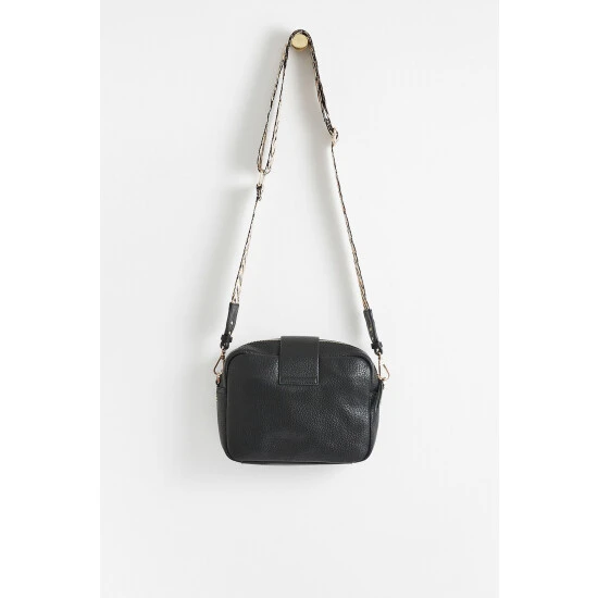 In a rectangular profile, this black crossbody bag contains one lined main compartment and one zipped inner pocket, with an outer slip pocket for your essentials. Featuring a contrasting animal print woven detachable crossbody strap in black, white and gold tones with gold-toned hardware, this bag is completed with a zip fastening and a fold-over flap.