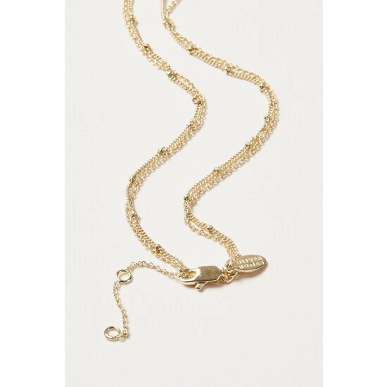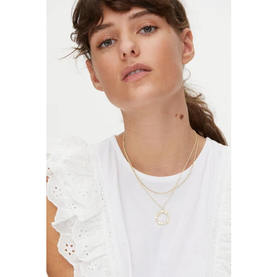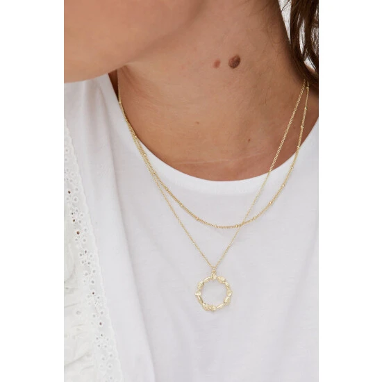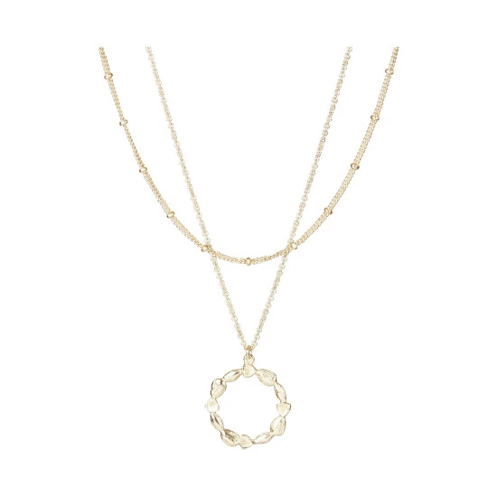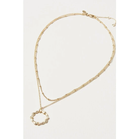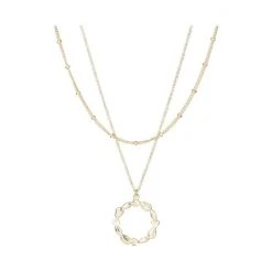 This layered necklace features two gold-plated chains with a hoop pendant, complete with an extendable chain and a lobster clasp.