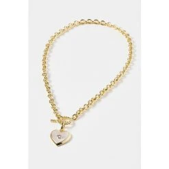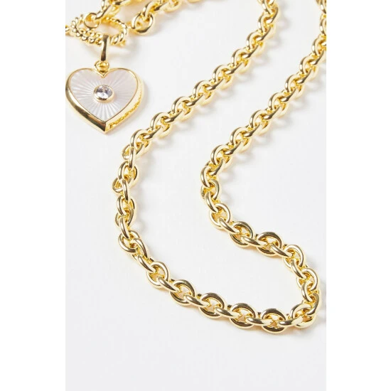 This gold-plated chunky chain necklace features a heart pendant with a mother of pearl inlay, detailed with a silver jewel placed in the centre and complete with a bar and ring clasp.