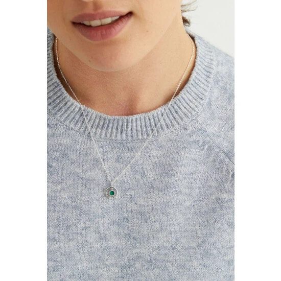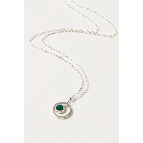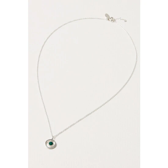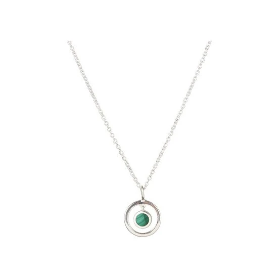 With a green stone suspended inside a silver hoop, this 925 silver pendant necklace is finished with an extendable chain and spring ring clasp.