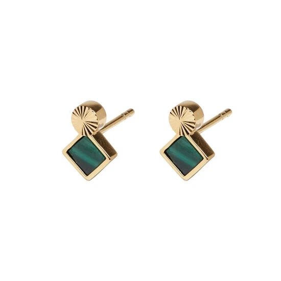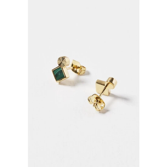 Oliver Bonas Green Corliss Square Stone And Engraved Disc Stud Malachite, Gold Plated Brass Earrings