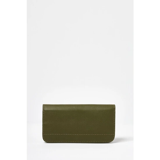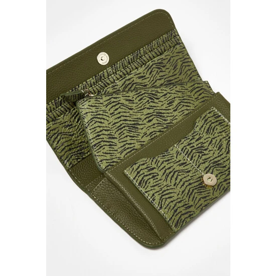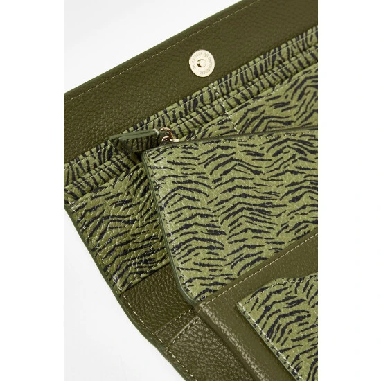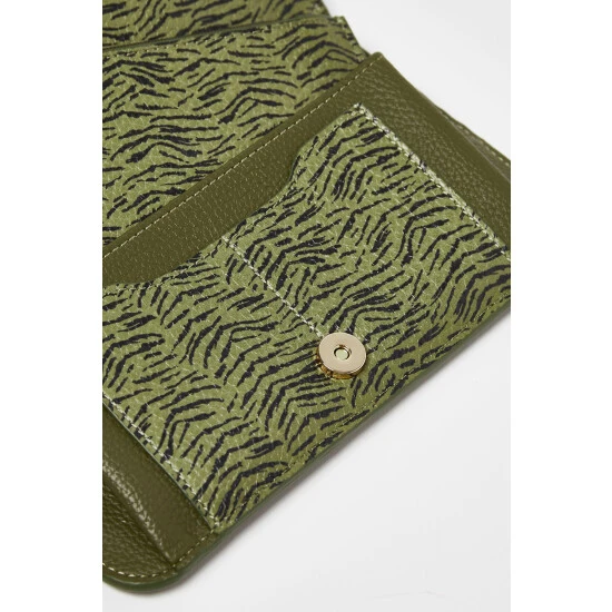 Keep your cards and coins safe in this khaki green purse adorned in a zebra print with a gold toned popper fastening.
