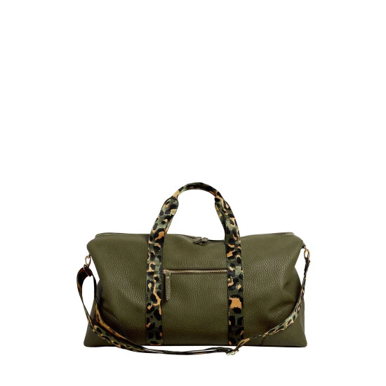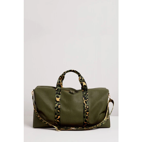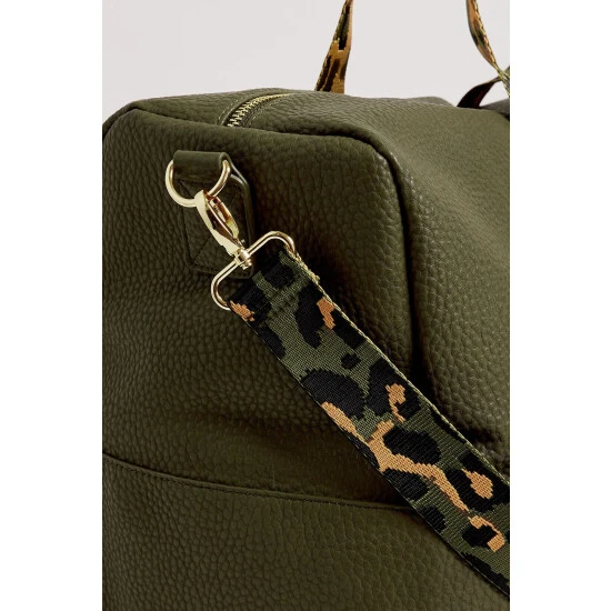 Pack everything you need for a weekend getaway in this large weekend bag. Made with PU, this khaki bag has a grab handle plus a removable cross-body strap in khaki and orange animal pattern. The weekend bag is complete with gold metalware and includes inner and outer zipped pockets to keep your smaller items secure.