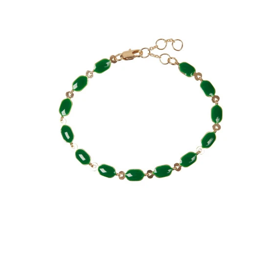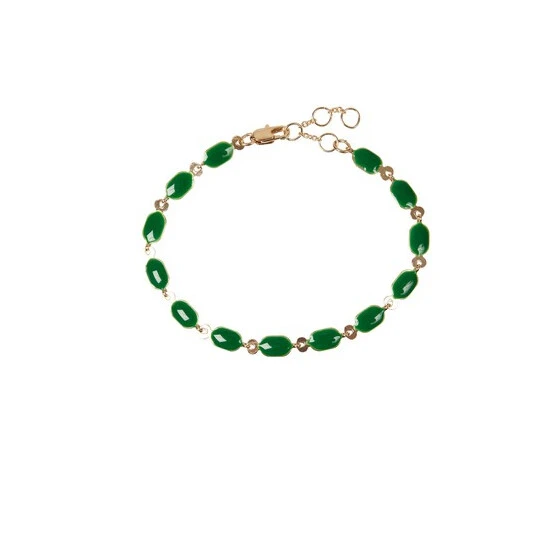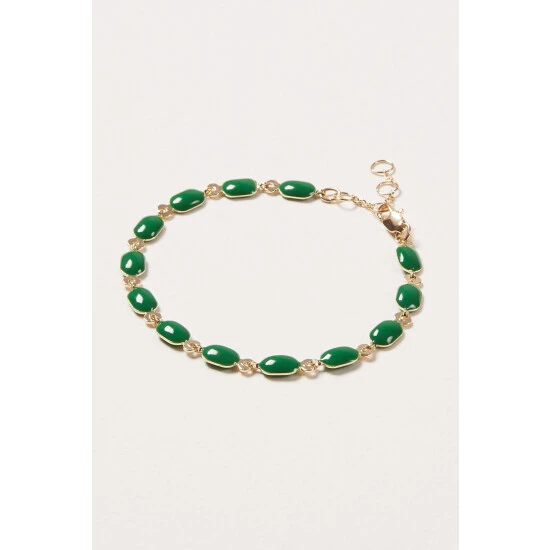 With deep green beads attached to gold toned links, this statement bracelet is completed with an adjustable length and lobster clasp.