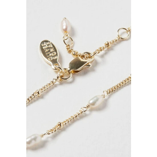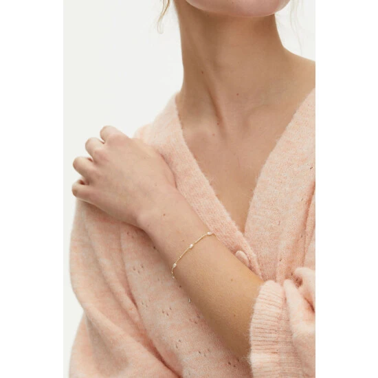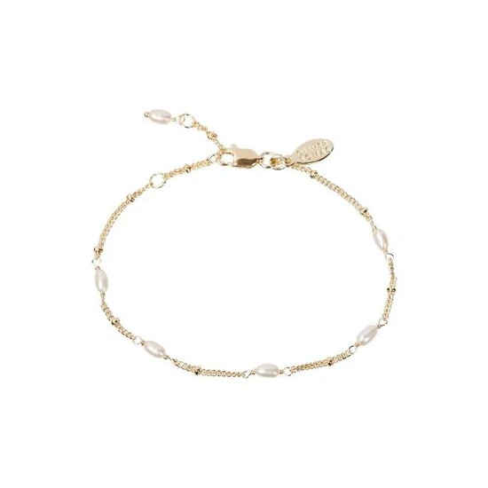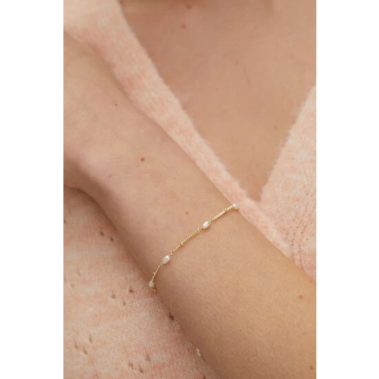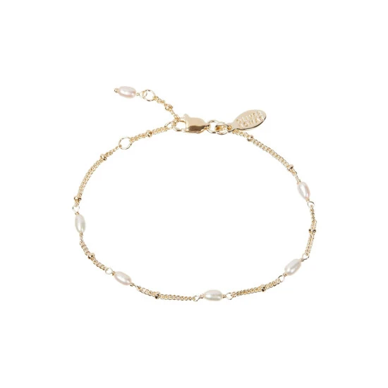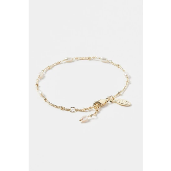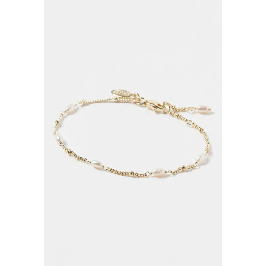 Oval shaped white pearls line a gold plated beaded chain bracelet. With an adjustable length and lobster clasp, wear alone or layer with your other favourite bracelets.