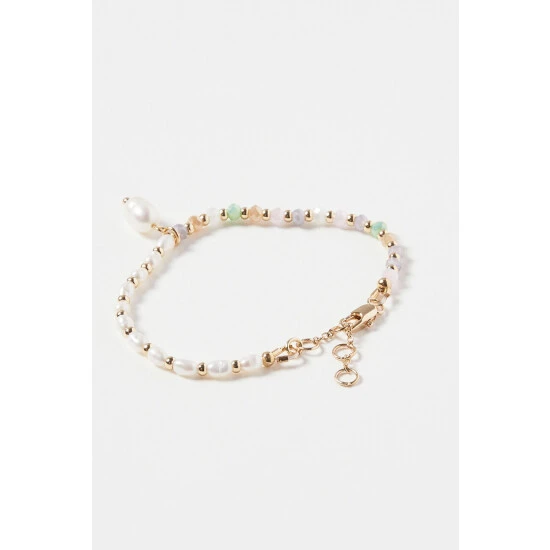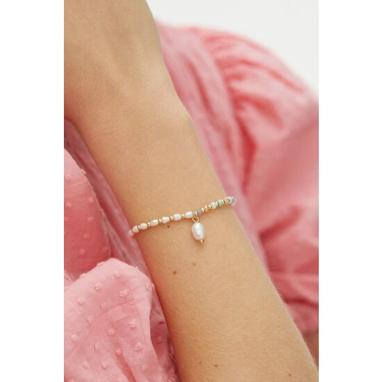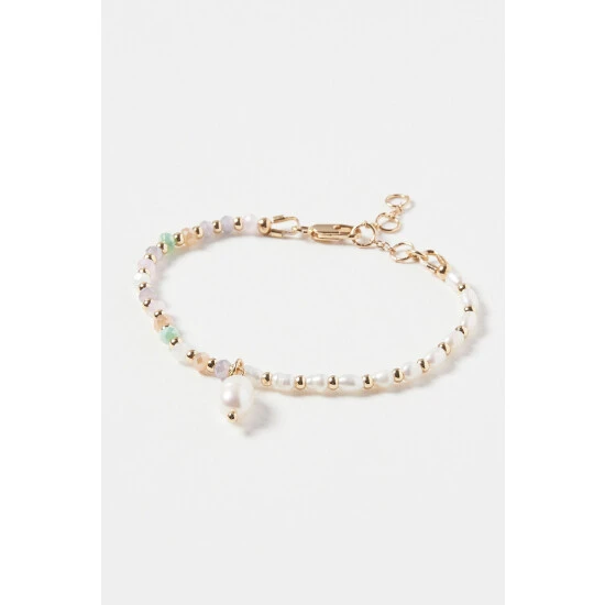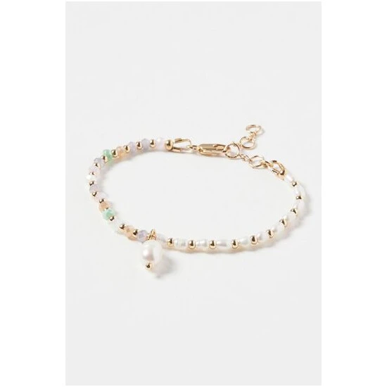 In a combination of white and pastel toned small beads, this chain bracelet has gold toned beads spread throughout. A single white pearl is suspended from the chain, with an adjustable length and lobster clasp.