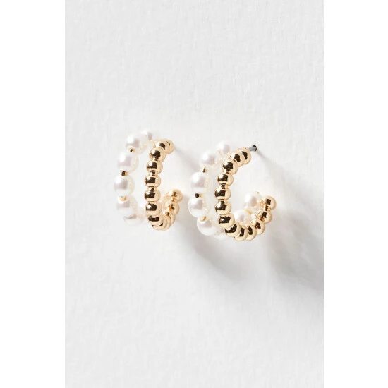 For a layered look, opt for these hoop earrings featuring a beaded gold toned row against elegant faux pearls, complete with stud backs.