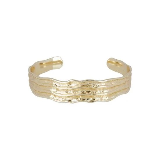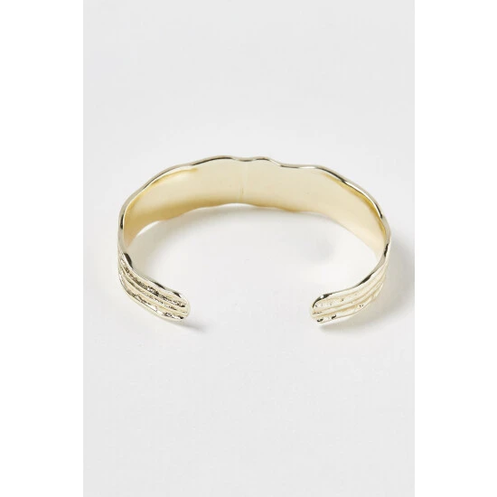 This gold-plated bangle has a wide organically shaped structure with a textured finish.