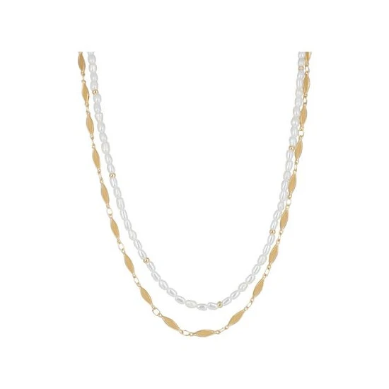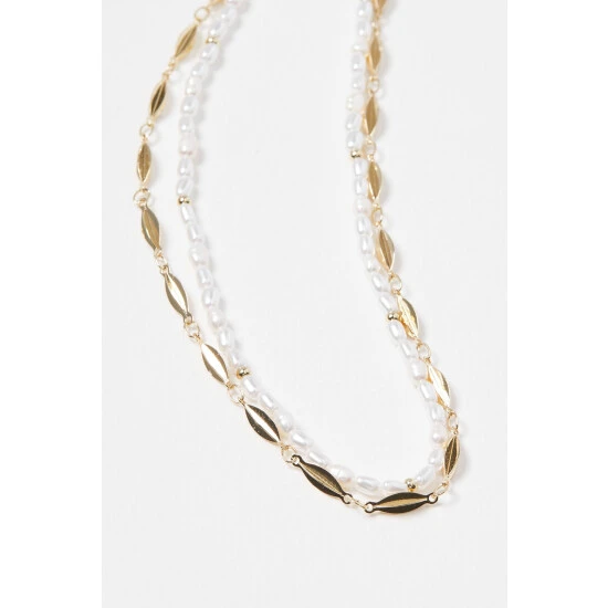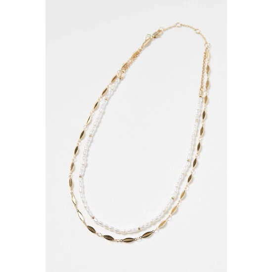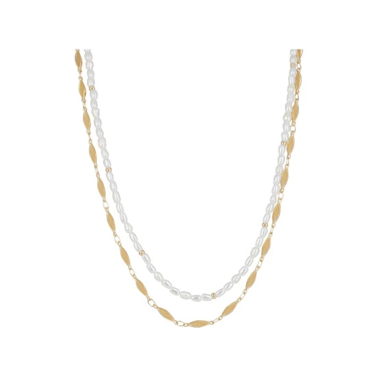 In a double row design, this layered necklace features a glossy gold toned link chain against a beaded faux pearl chain, complete with an extendable length and lobster clasp fastening.