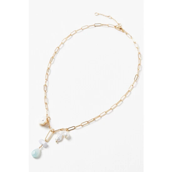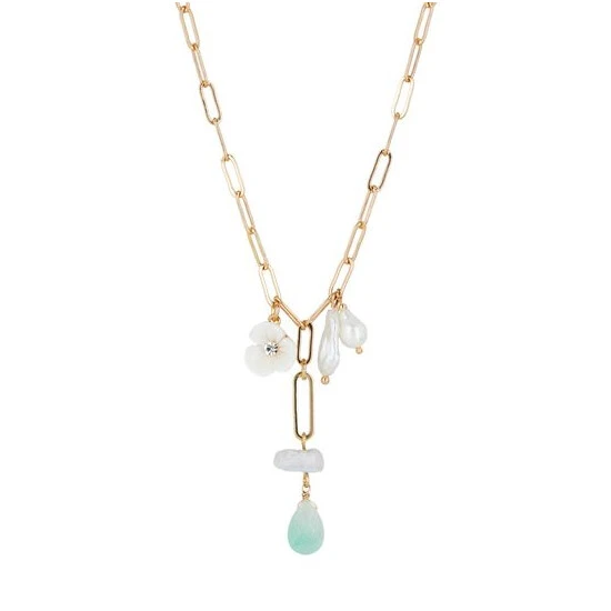 This gold-toned pendant necklace features floral, pearl and stone charms suspended from a chain, complete with an extendable chain and a lobster clasp.