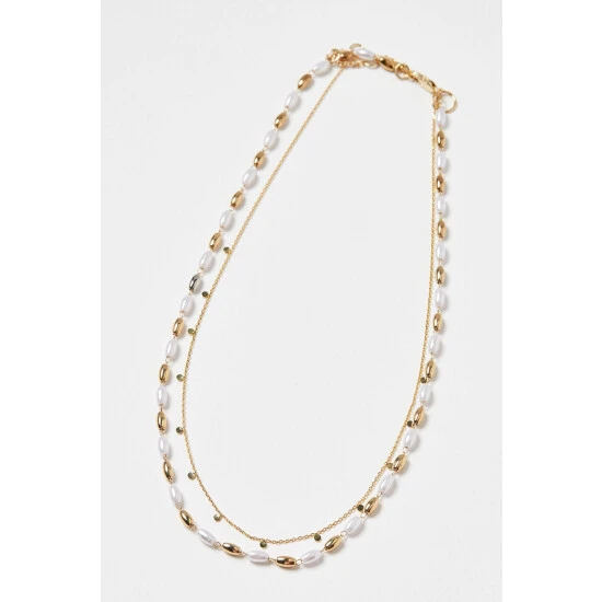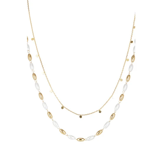 This layered chain necklace features a fine gold-toned chain detailed with small discs, paired with a pearlescent and golden beaded chain, complete with an adjustable chain and a lobster clasp.
