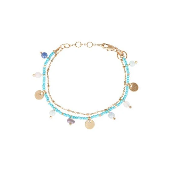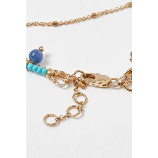 This layered collar necklace features a gold-toned fine chain paired with a bright blue beaded necklace, detailed with coloured disc, bead stone drops, complete with an adjustable chain and lobster clasp.