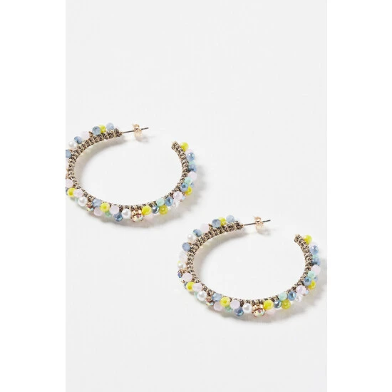 Adorned by a cluster of multi-coloured glass beads and faux pearls hangs a gold toned hoop with a chord finish, complete with stud backs.