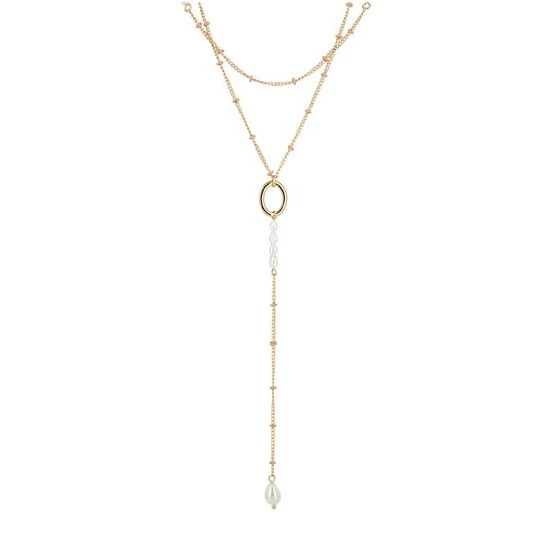 This gold-toned layered chain necklace is detailed with pink enamel rings and pearl beading, complete with an extendable chain and a lobster clasp.