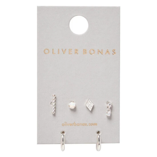 Mix and match. In a pack of three pairs, silver hoop earrings sit as a staple that offset with the stone inlayed and beaded textured pairs.