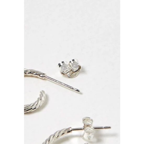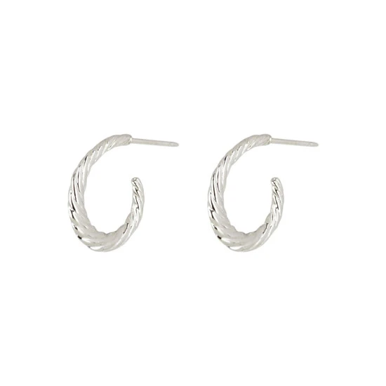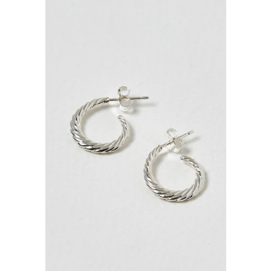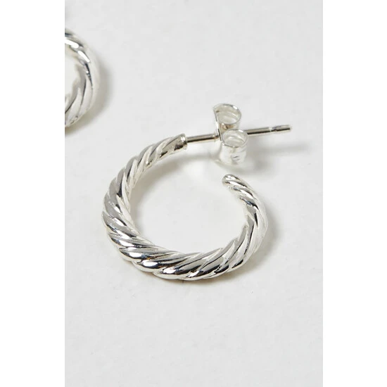 These small silver 925 hoop earrings have a curved structure with a twisted finish, complete with stud backs.
