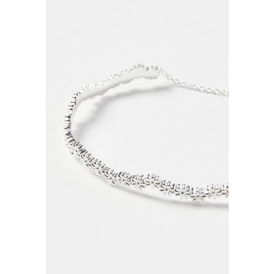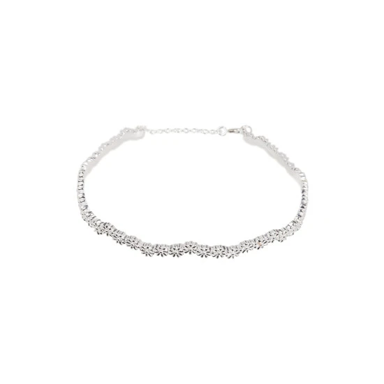Dainty silver flowers trickle around a bangle in a wavy line. With an adjustable chain and lobster clasp, this bangle is a spring must-have.