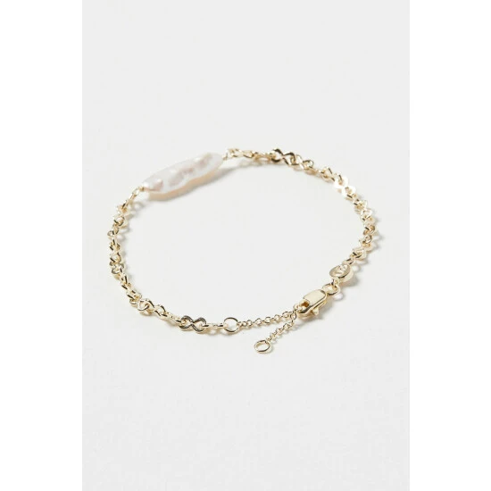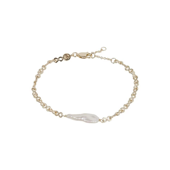 This gold-toned chain bracelet features a long pearl centring a wiggly chain, complete with an extendable chain and a lobster clasp.