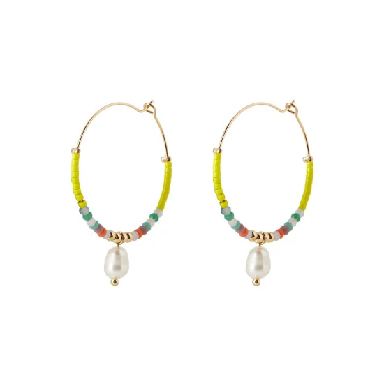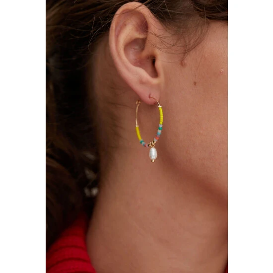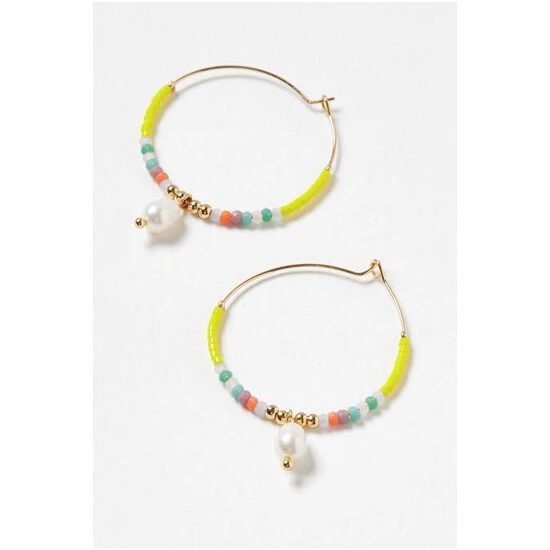 Vibrant seeded beading is threaded through gold-toned hoops with a faux pearl drop taking centre stage, complete with a hook clasp.